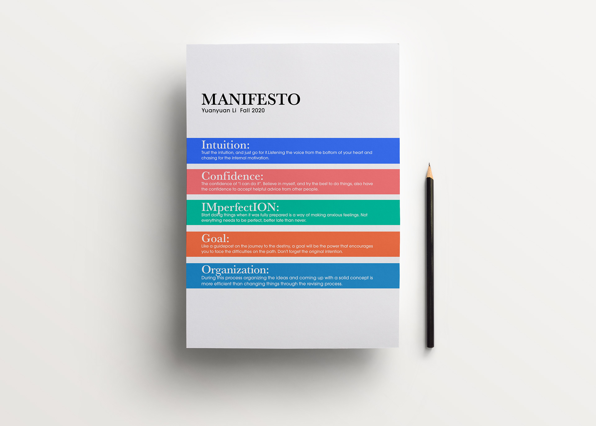 The goal of this manifesto is creating a macro personal guide of design, and also a guide for life at this stage. The five key points here represented five qualities that will be the anchor point of growth and self-improvement.